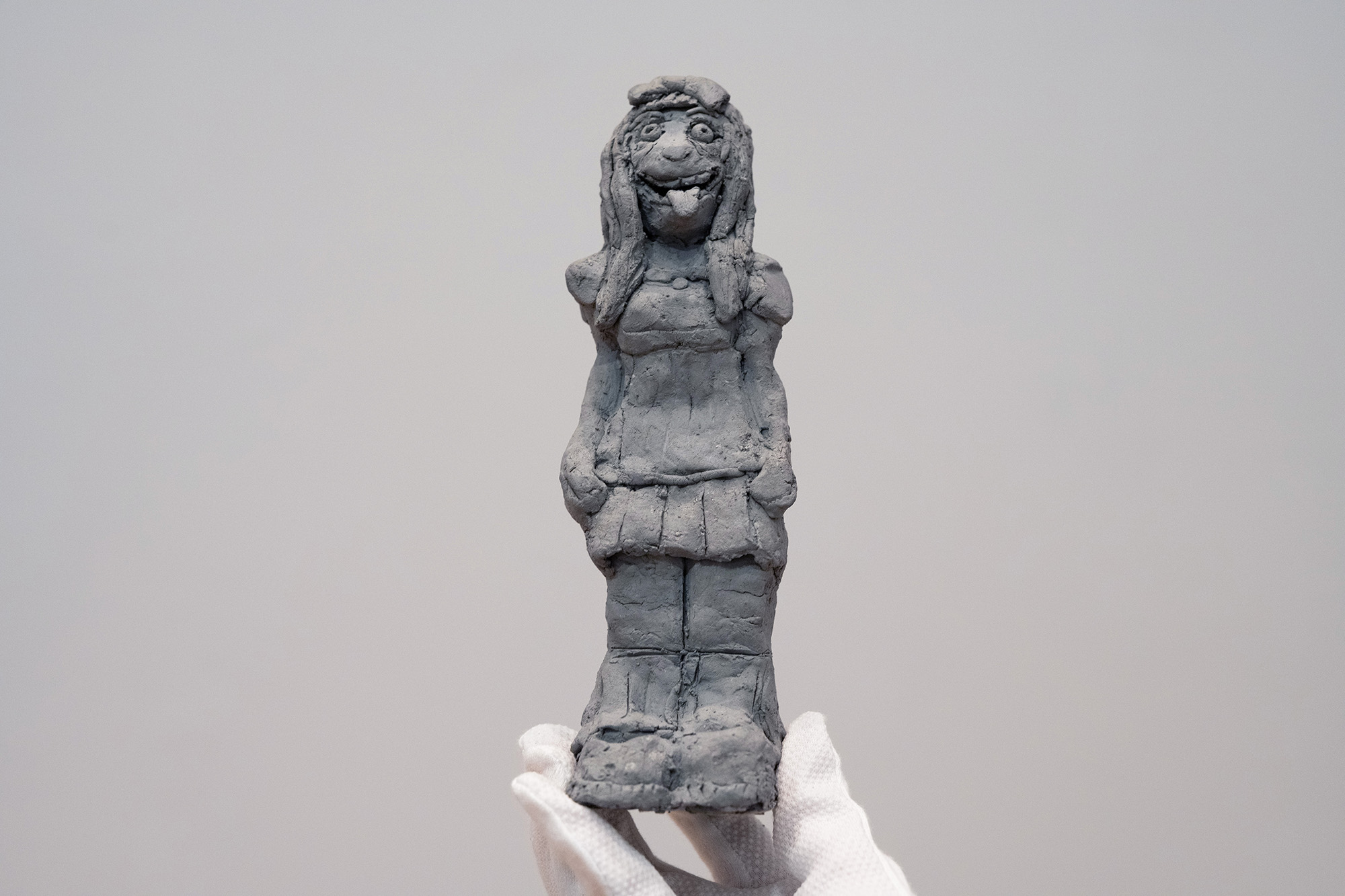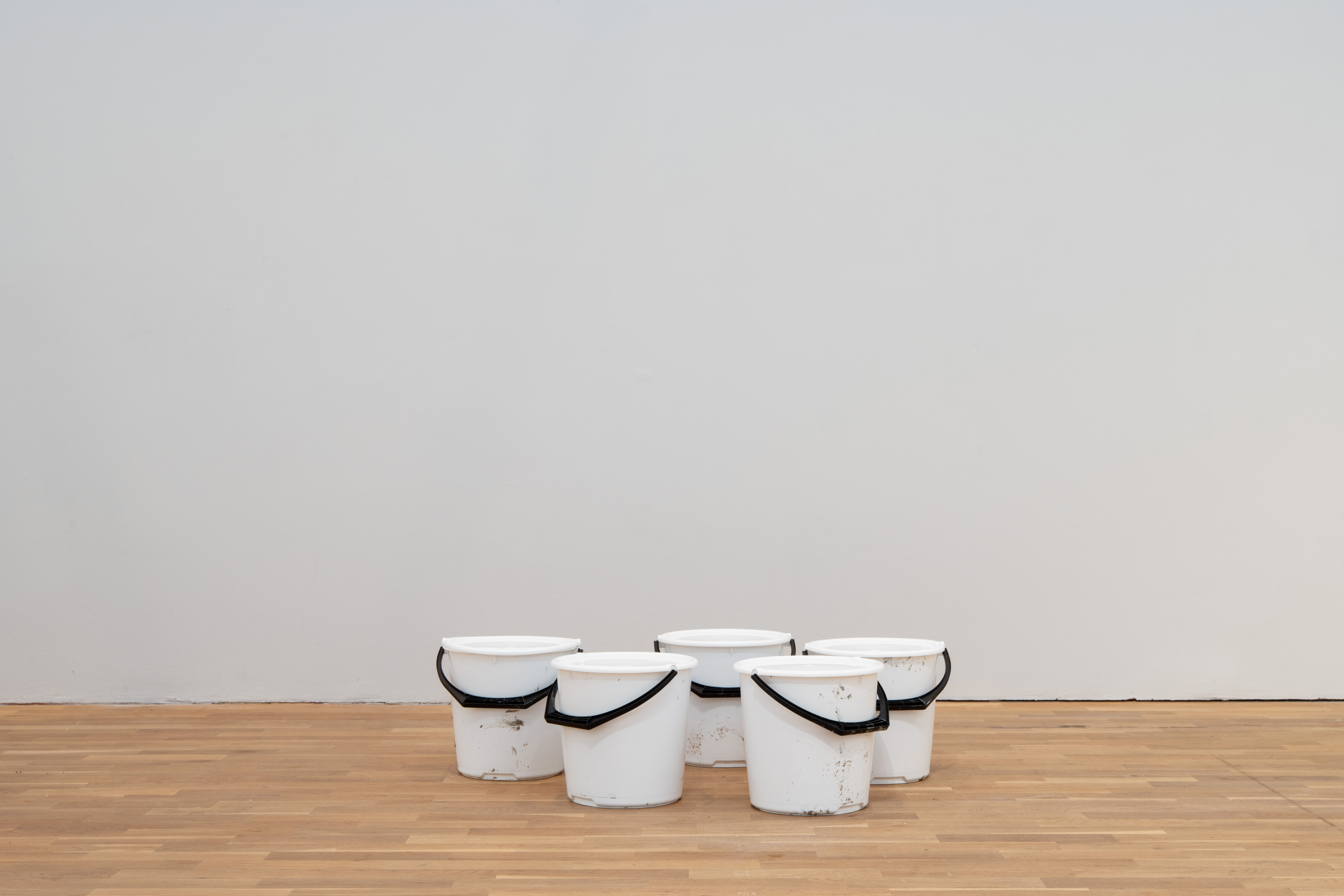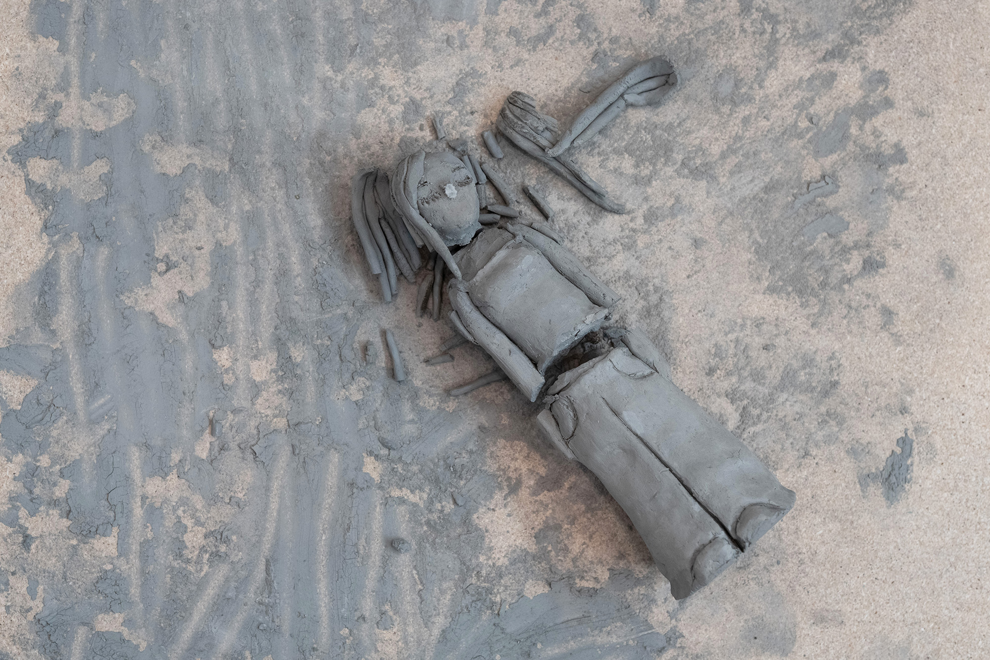 De torkade lerfigurerna slås sönder av konstnären och blandas med vatten till en lerfärg.
