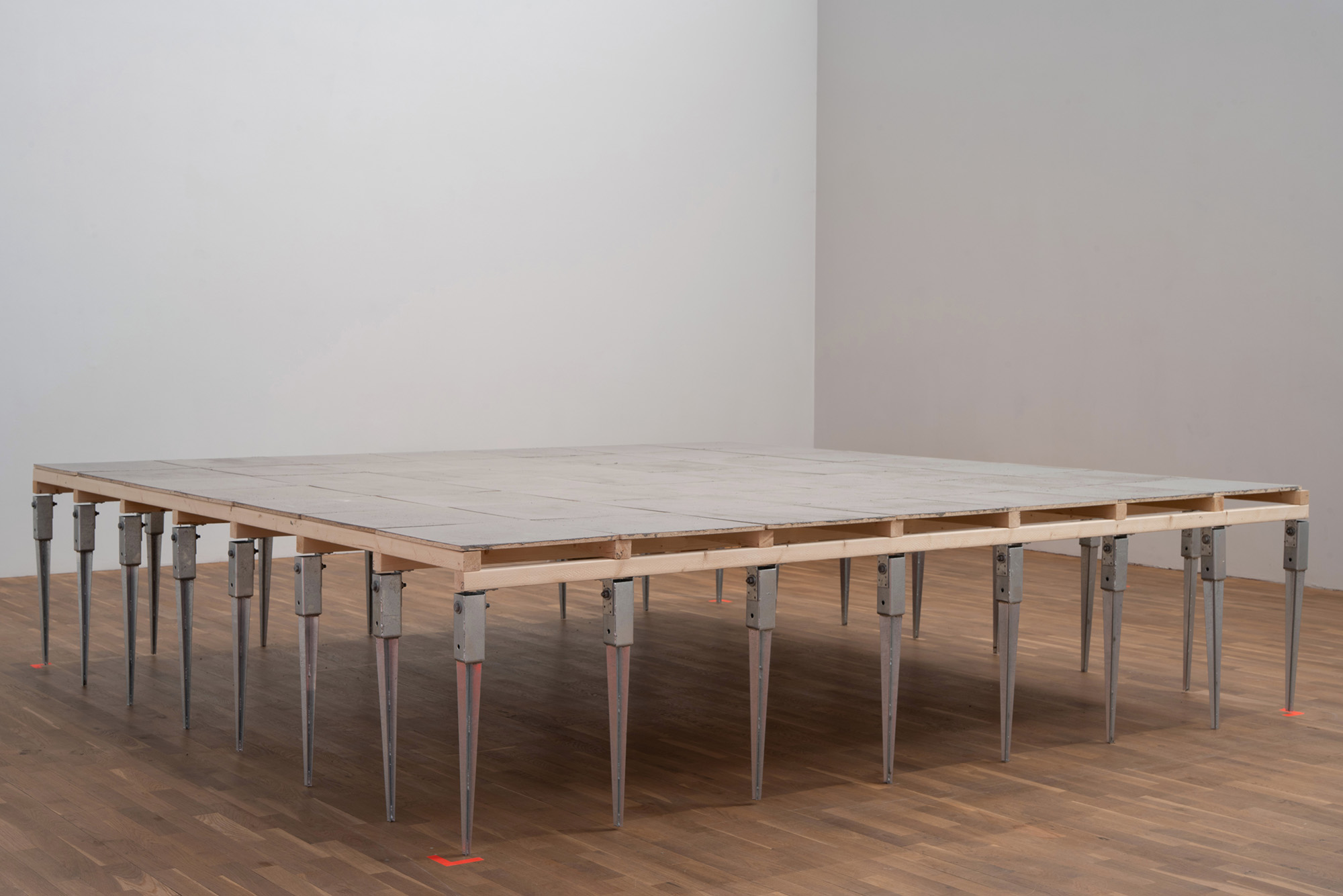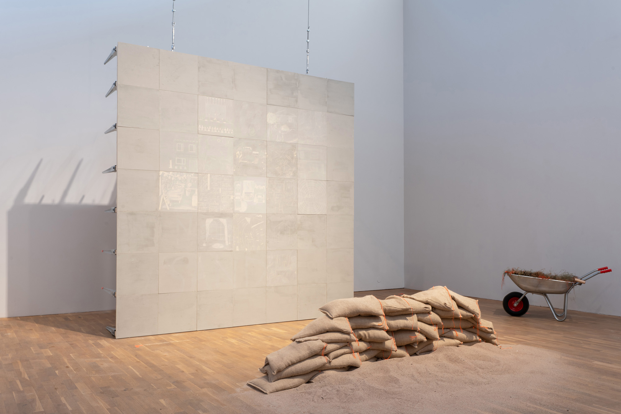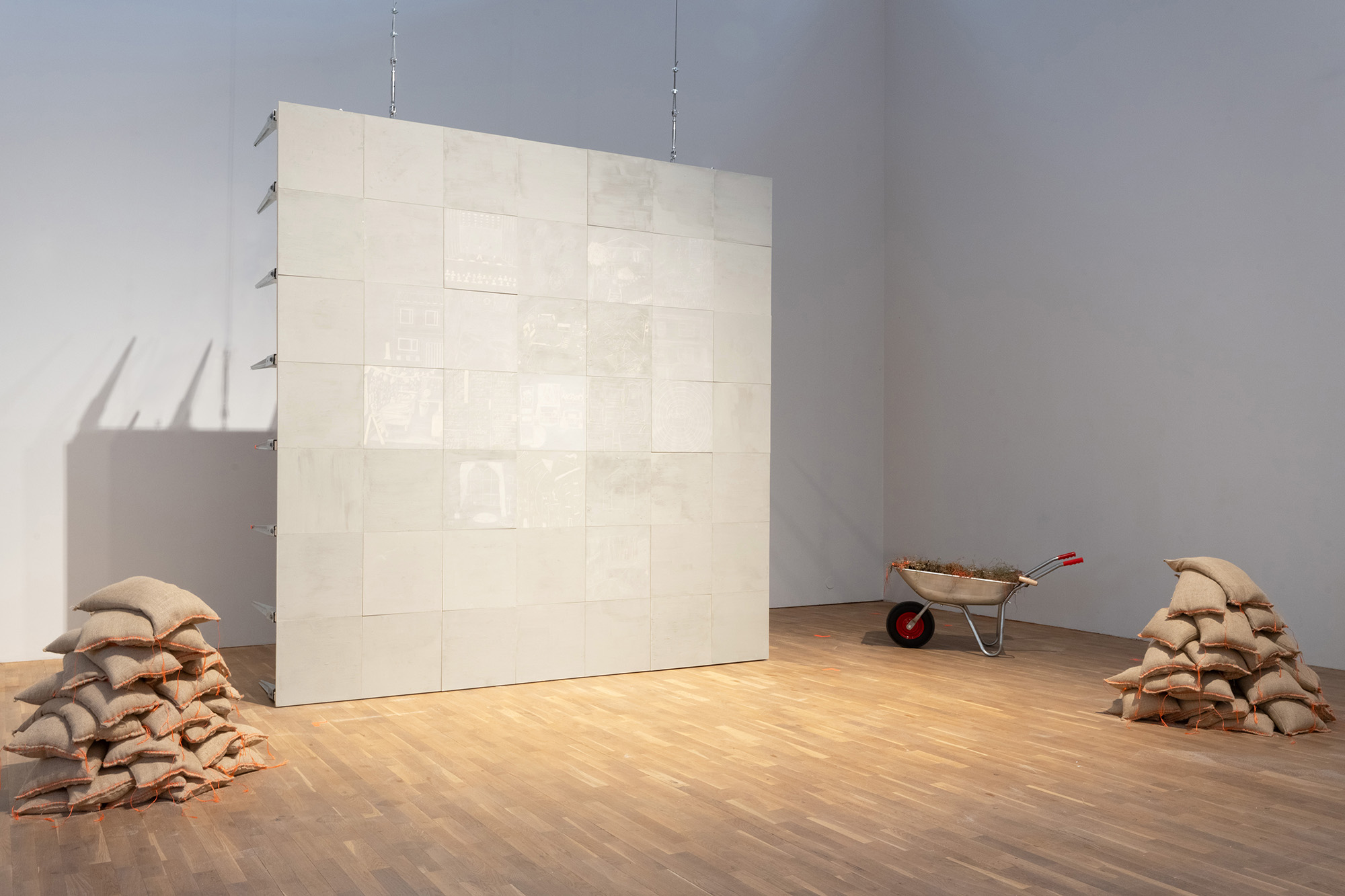 Spånskivorna placeras lodrätt mitt i rummet under scen 3.