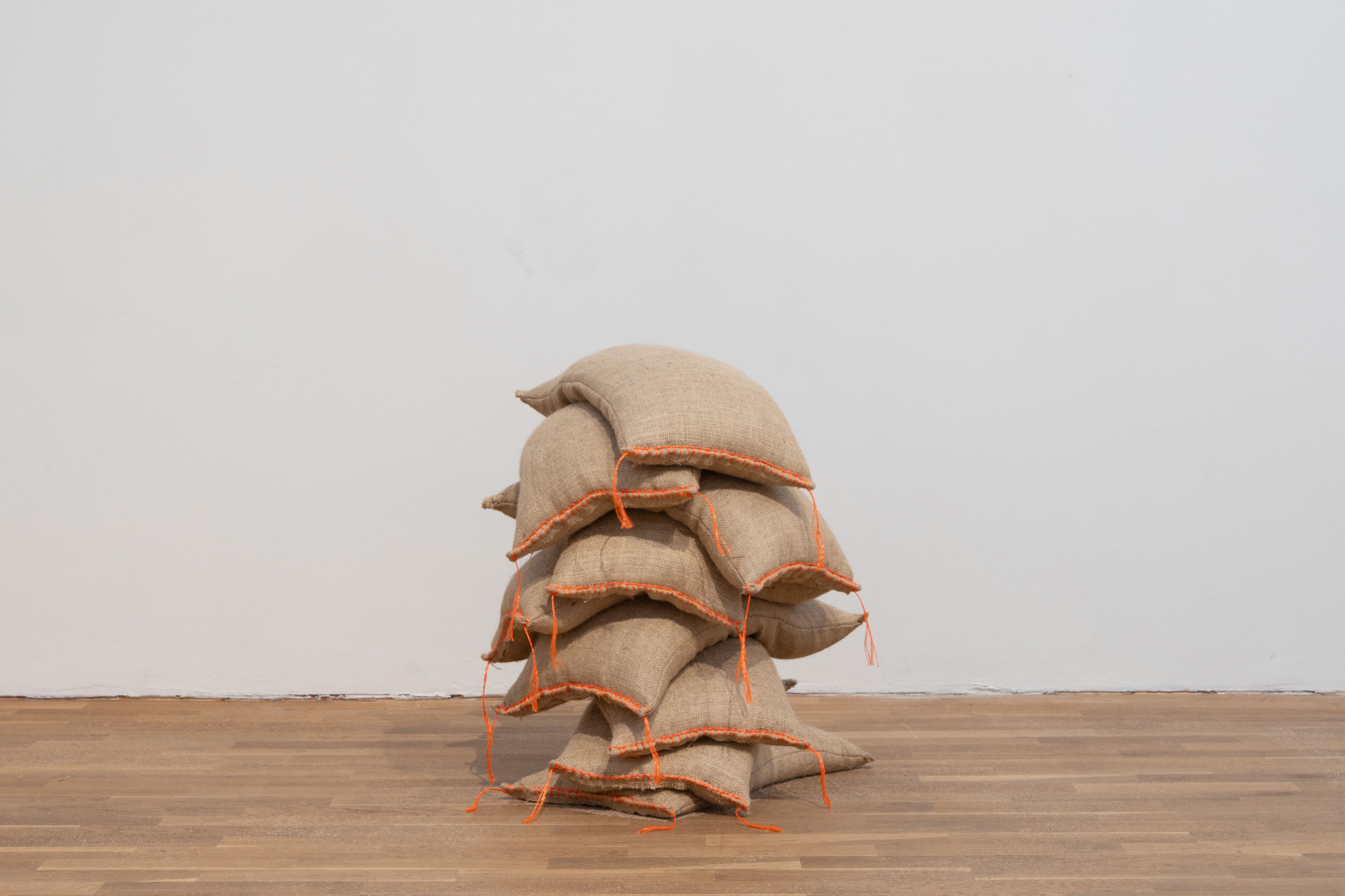Säckarna sys igen av konstnären. och konstverkstan under scen 1 och 2.