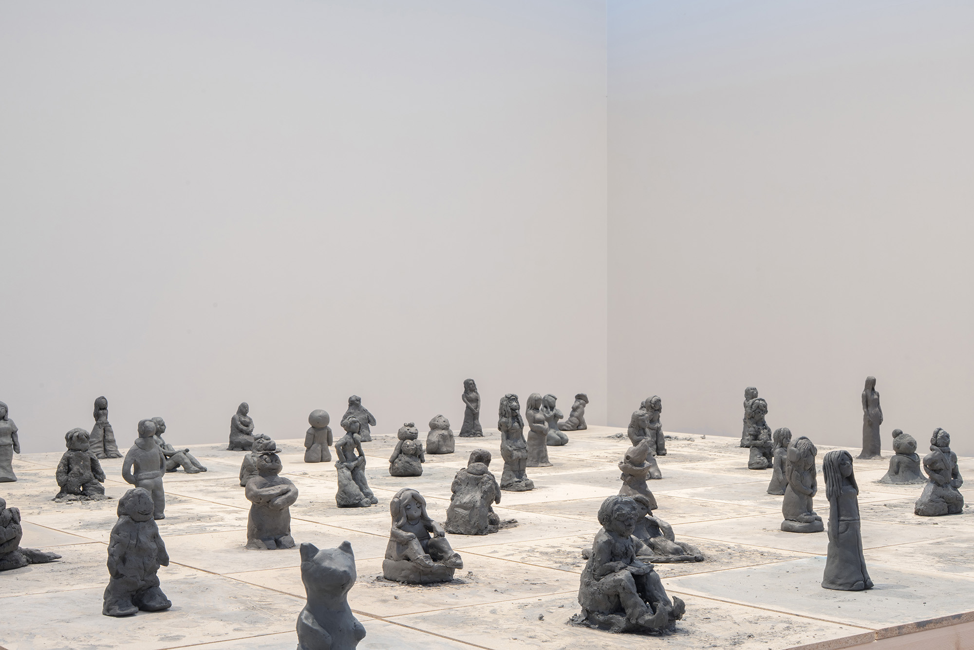 Lerfigurerna placeras vågrätt i en upphöjd formation i mitten av rummet.